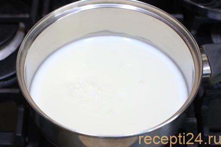 В кастрюлю с закипающим молоком ложкой постепенно вводим полученную смесь, равномерно растворяя ее в горячей жидкости.
