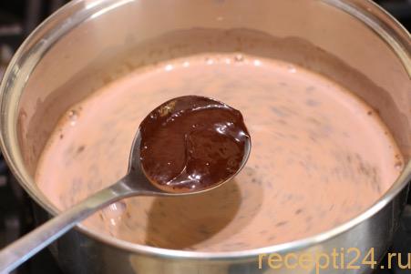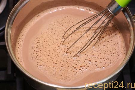 С помощью венчика или миксера хорошенько перемешиваем содержимое кастрюли. Оставляем на маленьком огне прокипеть еще 2 минуты. На этом этапе нужно внимательно следить, чтобы жидкость не сбежала на плиту.