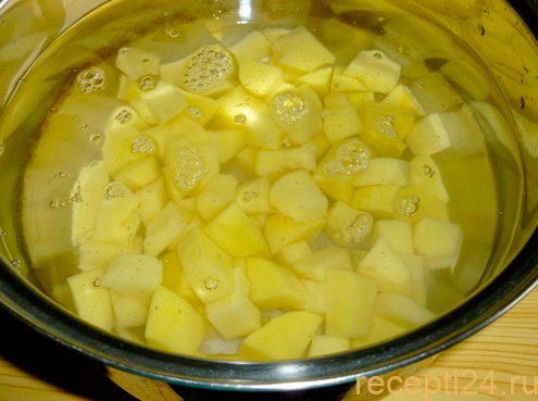 Нарезанные бруски помещают в кастрюлю к картошке и отваривают еще 7 минут.