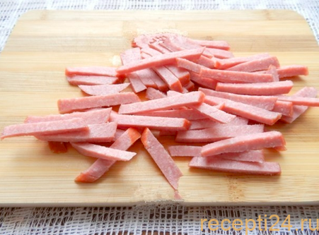 450 г вареной колбасы нарезают на длинные бруски. Около ста граммов откладывают для обжаривания.