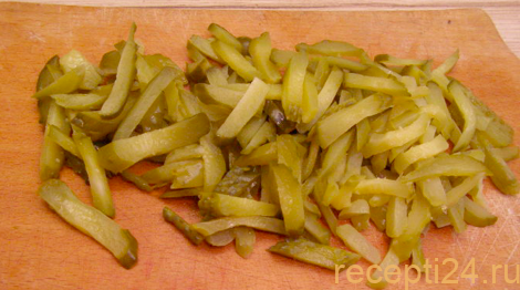 Три соленых огурца нарезают на соломку. Перекладывают их в кастрюлю и готовят еще 5 минут.