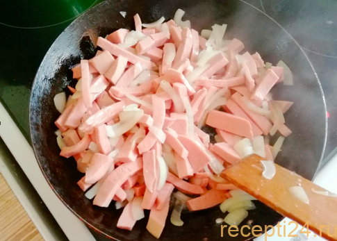Компоненты, указанные в рецепте, берутся в расчете на кастрюлю объемом 3,5-4 литра. Если колбасу брать не хочется или ее нет в холодильник, можно использовать сосиски.
