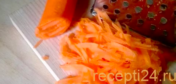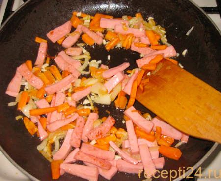 Морковку натирают на крупной терке, отправляют в посуду к луку и колбасе. Продолжают пассировать 3-5 минут.