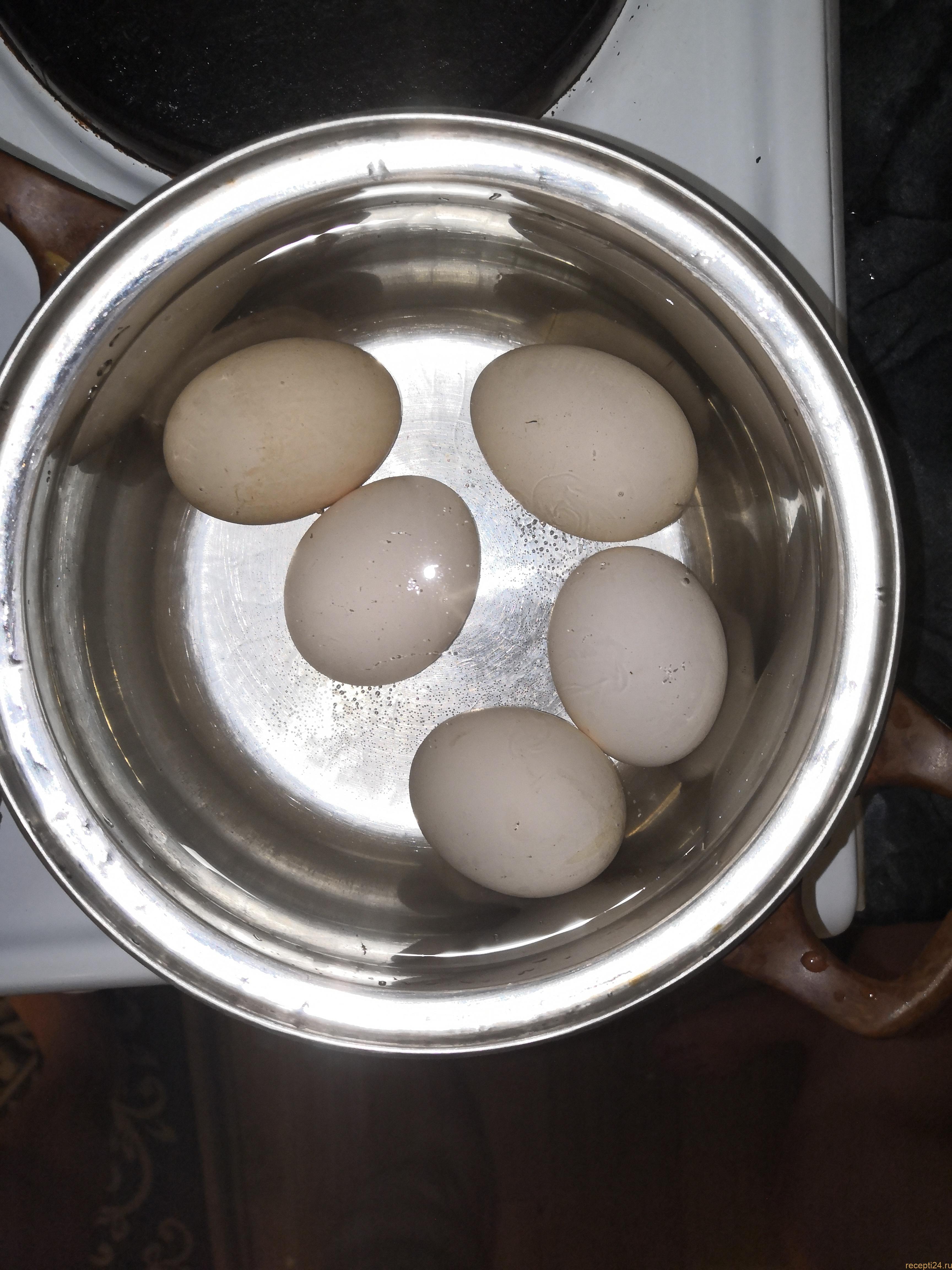Отвариваем 5 куриных яиц в течении 10-15 минут. Воду посалить. Пока куриные яйца начинают вариться, приступает к следующему шагу.