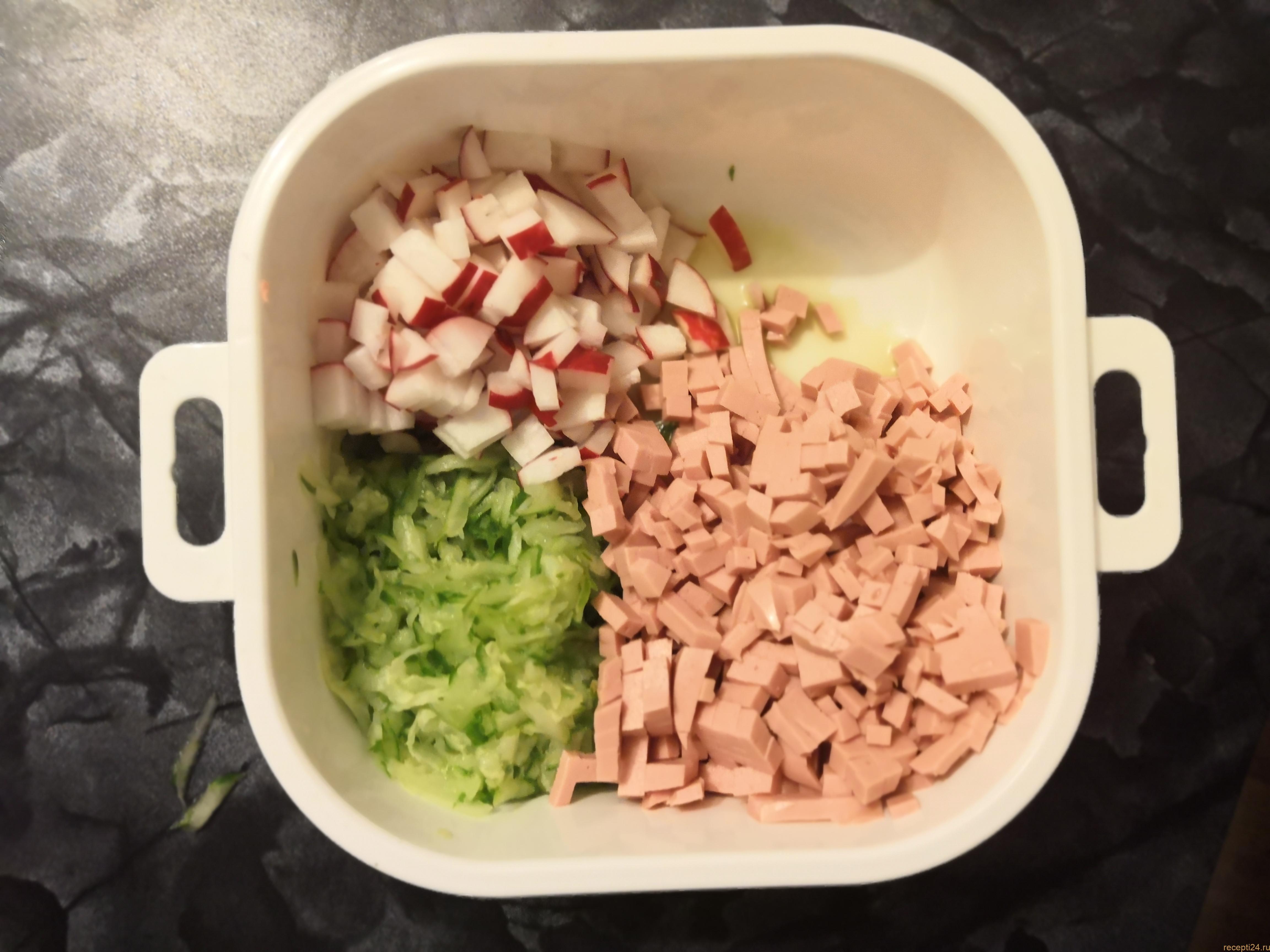Редис в количестве 3 шт. нарезаем и складываем в общую посуду