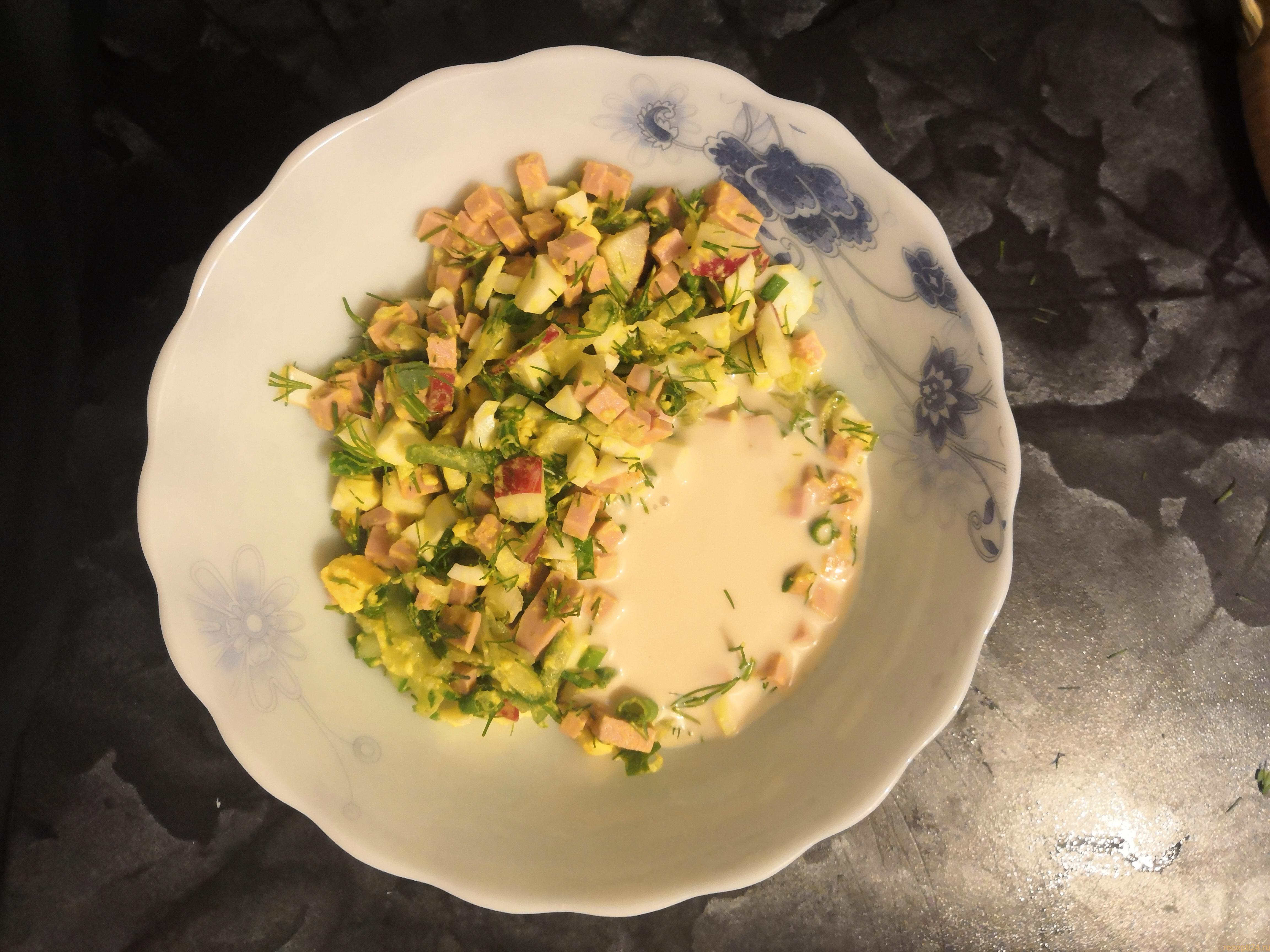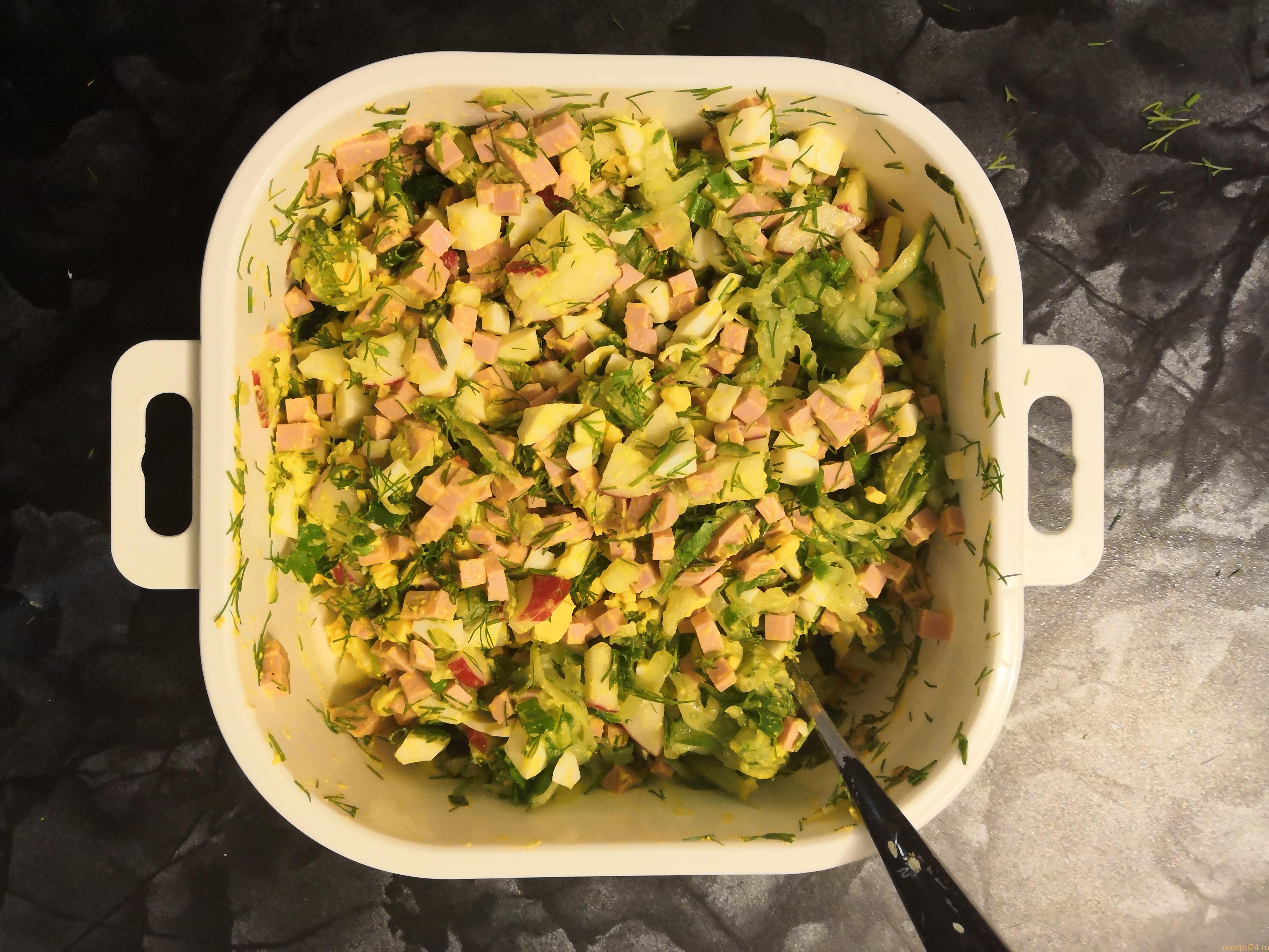 - Колбасу, мясо рыбу что бы вы не выбрали добавляете 1:1 ко всем остальным ингредиентам, будет вкусно и сытно.