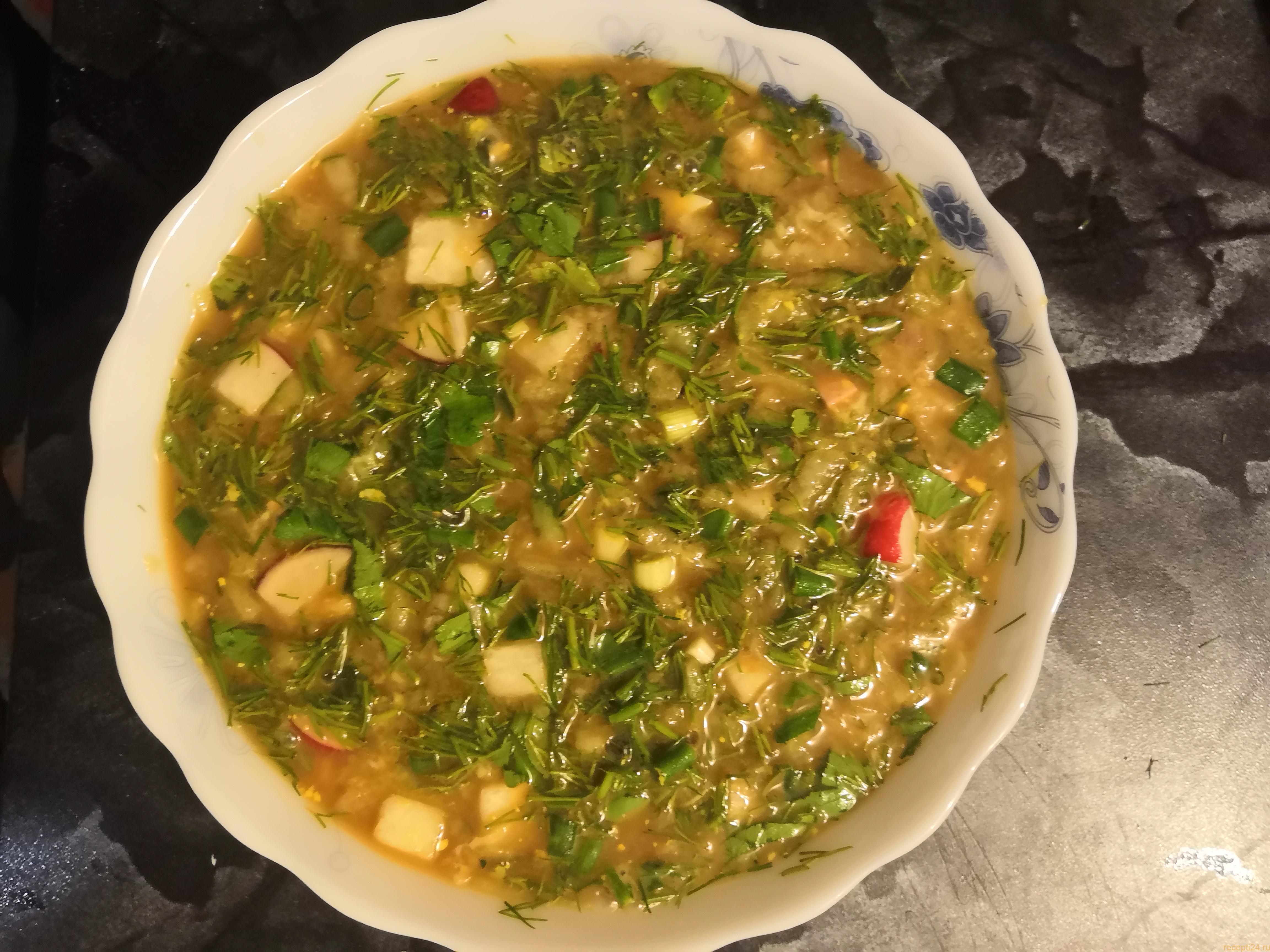 Заливаем все это холодным квасом и аккуратно перемешиваем. Наслаждаемся нашим блюдом!