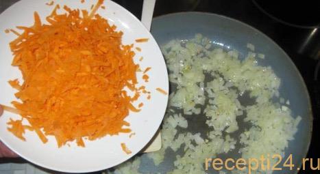Почистить 1 большую морковь и 2 средних луковицы. Морковь натереть, лук нарезать мелким кубиком и отправит его на разогретую сковородку с двумя столовыми ложками подсолнечного масла. Когда лук станет прозрачным, добавить морковь и тоже пассировать примерно 5 мин.