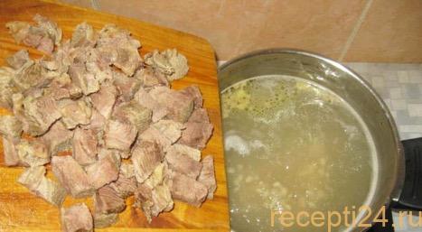 Достать мясо из бульона, нарезать его крупными кусочками и вернуть обратно, в кастрюлю.
