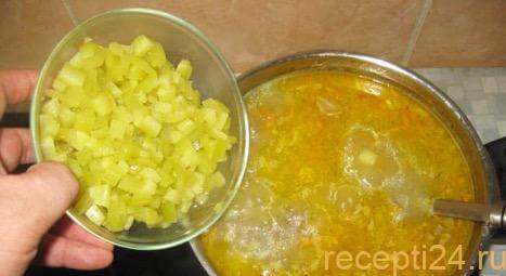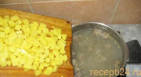 4 средние картофелины почистить и нарезать средним кубиком. По прошествии 50 минут с начала варки, засыпать в кастрюлю нарезанный картофель и оставить на 10 минут.