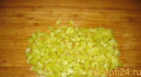 Пока варятся первые 2 ингредиента, можно подготовить остальные. С 300 г соленых огурцов нужно снять кожицу и нарезать их мелким кубиком.