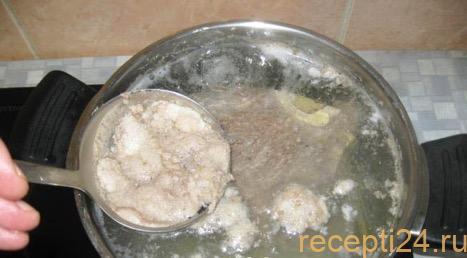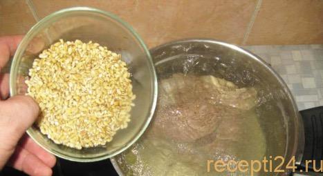 По прошествии этого времени, засыпать перловку в кастрюлю с кипящим бульоном, которому остается вариться еще примерно 40 минут.