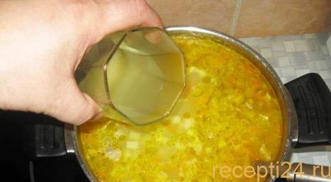 Несмотря на то, что рассол и соль по вкусу должны добавляться в конце, в самом начале варки нужно добавить небольшую щепотку, чтобы крупа, которая при варке будет напитываться бульоном, внутри не была пресной при раскусывании.