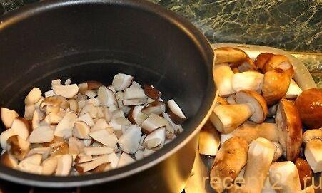 После этого, грибы необходимо мелко нарезать и отправить в кастрюлю. Надо обжарить в сливочном масле, пока не испарится вся влага.