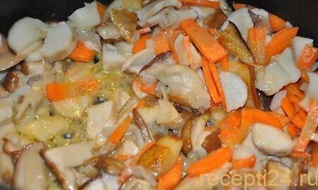Пока грибы жарятся, нужно очистить лук и морковь. Овощи мелко нарезают и отправляют в кастрюлю. На этом этапе нужно добавить соль и перец по вкусу. Важно, что смесь не пригорела. При необходимости можно добавлять масло.