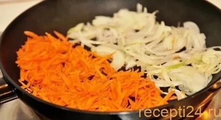 1 луковицу нарезать мелким кубиком. 1 морковь тонкой соломкой. Пассеровать в течение 3 минут на сковороде.
