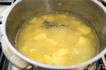 Бульон готовится в течение 30 минут. После достать хребты. Положить нарезанный картофель. Добавить обжаренные овощи к бульону.