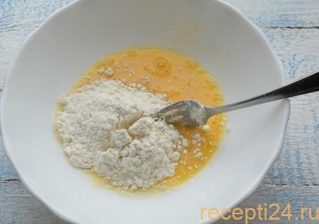 Все хорошо перемешивают вилкой, после чего добавляют муку. Делать это нужно постепенно, чтоб не было комочков. Для смешивания также можно использовать венчик.