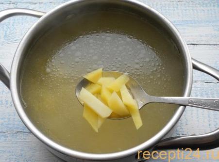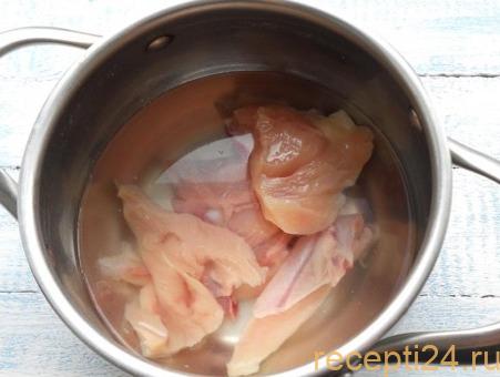 Сначала стоит поставить вариться бульон. Для этого курицу заливают холодной водой и ставят на огонь на 30-35 минут. Стоит не забыть посолить по вкусу.