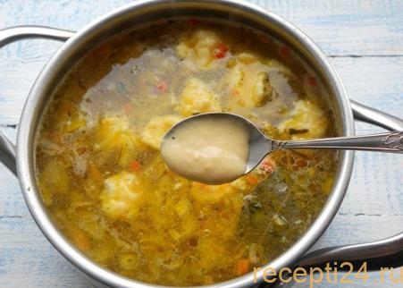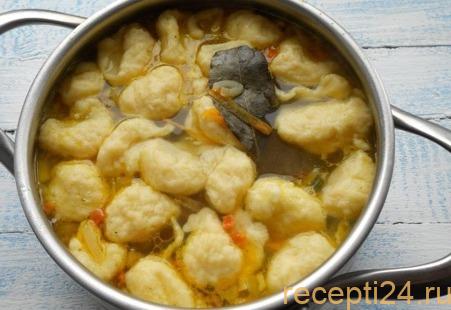 Готовность супа определяется по клецкам. Если галушки всплыли — он готов. Нужно периодически помешивать блюдо, чтоб клецки не слиплись.