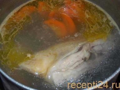 После первого кипения обязательно слить воду. Перед варкой с окорочка нужно снять кожу. Эта часть курицы не полезная, добавляет излишней жирности.