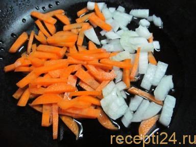 Разогреваем сковороду. На разогретую основу наливаем 1 ч. л. подсолнечного масла и 40 гр сливочного. Кладем лук с морковкой. Обжариваем 5 минут. Постоянно помешиваем.