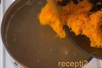 Пассированные овощи добавляем к бульону. Пробуем суп на соль и перец. Добавляем специи по своему вкусу.
