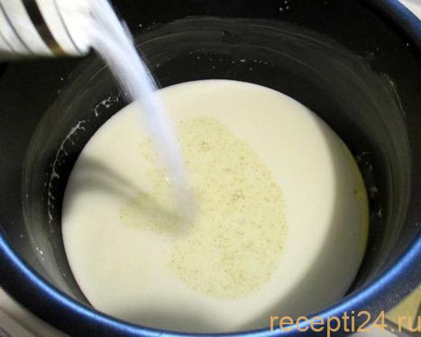 В закипевшую массу аккуратно понемногу всыпаем 20 г сахара, 8 г ванильного сахара и 70 г крупы. Делать это нужно одной рукой, чтобы второй можно было постоянно перемешивать крупу во избежание образования комочков.