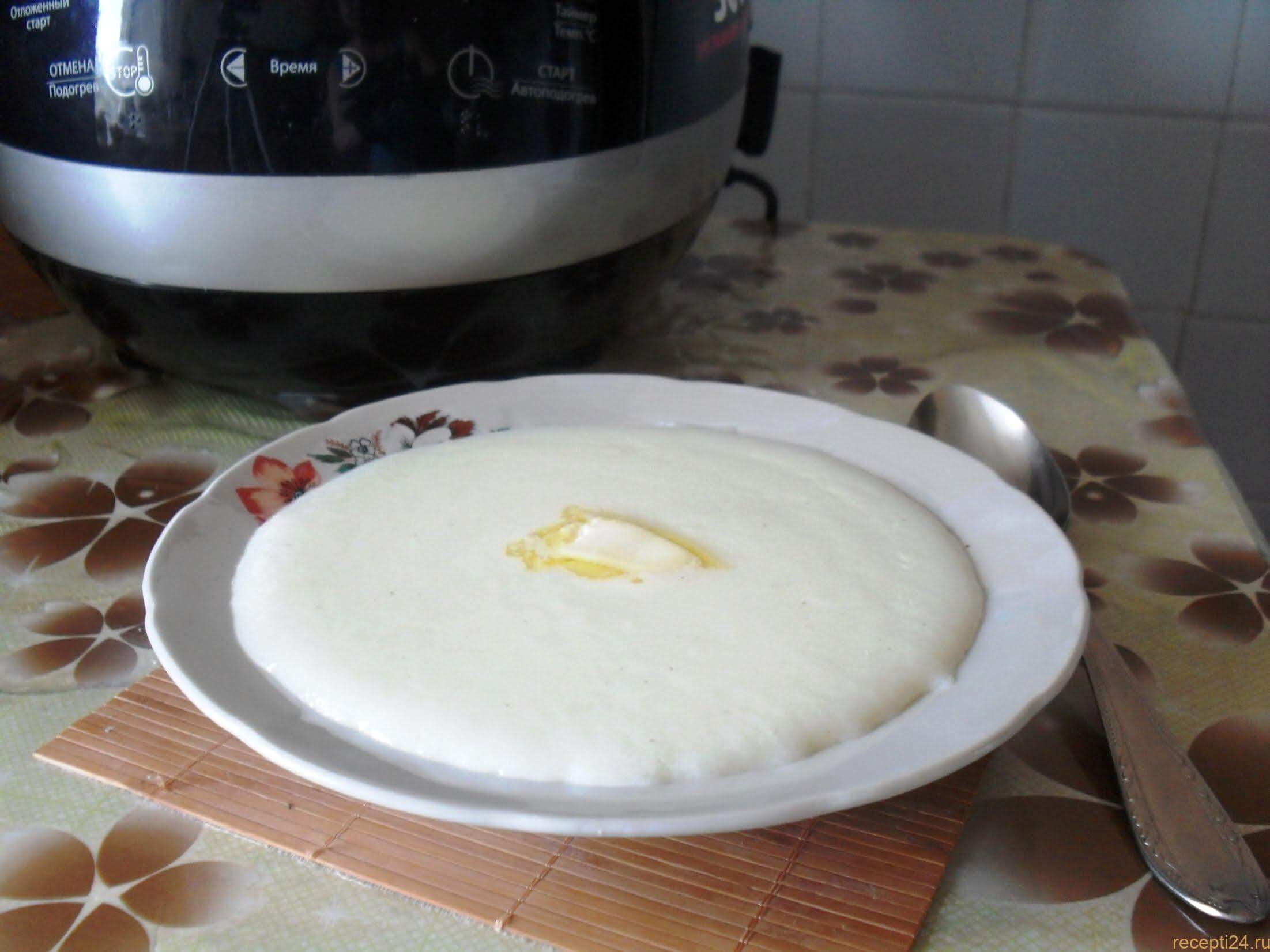350 г молока и 350 г воды заливаем в мультиварку, добавляем щепотку соли и 20 г сливочного масла. Закрываем крышкой и доводим до кипения. В зависимости от модели машины время может незначительно отличаться. В среднем этот процесс занимает 8-10 мин.