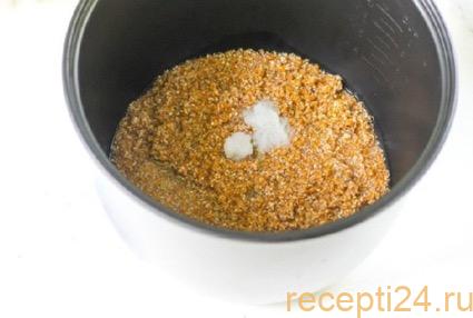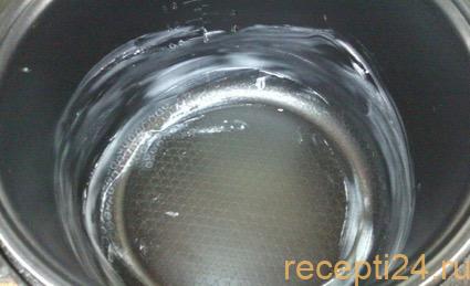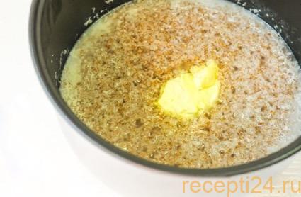 Перед приготовлением обязательно надо смазать мультиварочную чашу сливочным маслом. Оставшееся масло оставить на дне. Выложить промытую и отцеженную от воды крупу. Равномерно распределить ее внутри.