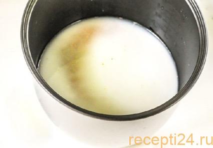 Добавляем воду. Вливаем молоко. При использовании отложенного старта молоко должно быть холодным. Летом, когда очень жарко можно молоко замораживать брикетами по 0,5 литра и использовать при варке каши. В мультиварке любого типа есть режим «Молочная каша». Затем кнопкой «Таймер» выбрать нужное количество часов до начала приготовления. Осталось закрыть мультиварку крышкой.