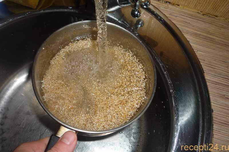 Далее следует прополоскать крупу водой. Слегка перетираем руками и меняем воду, пока она не станет совершенно прозрачной.