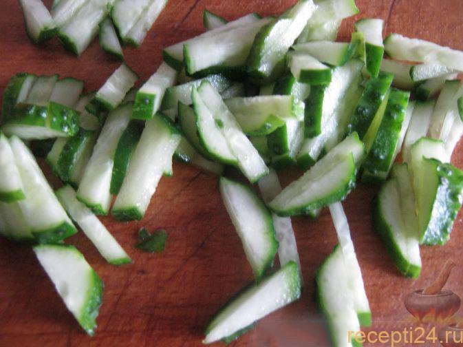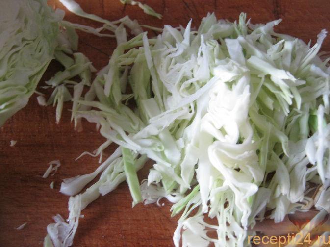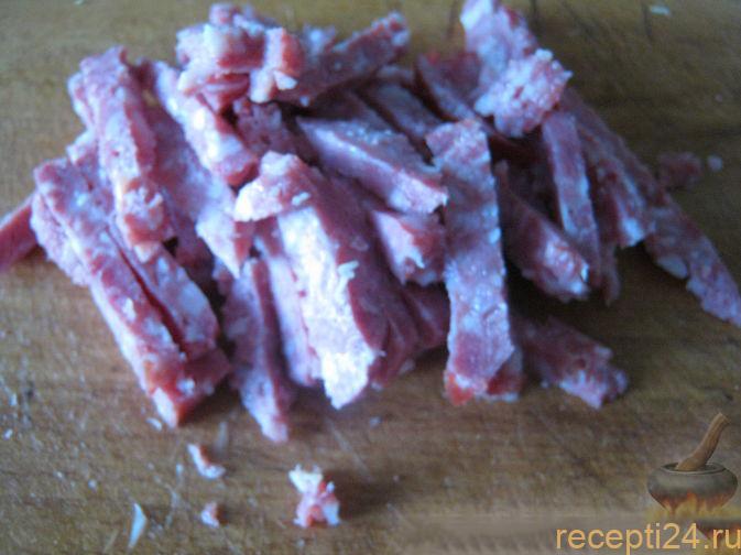 Колбасу нарезаем соломкой. Вместо копченной колбасы можете использовать вареную или ту, что вам по вкусу. Так же вместо колбас можно использовать мясо. Мясо следует обжарить с луком.