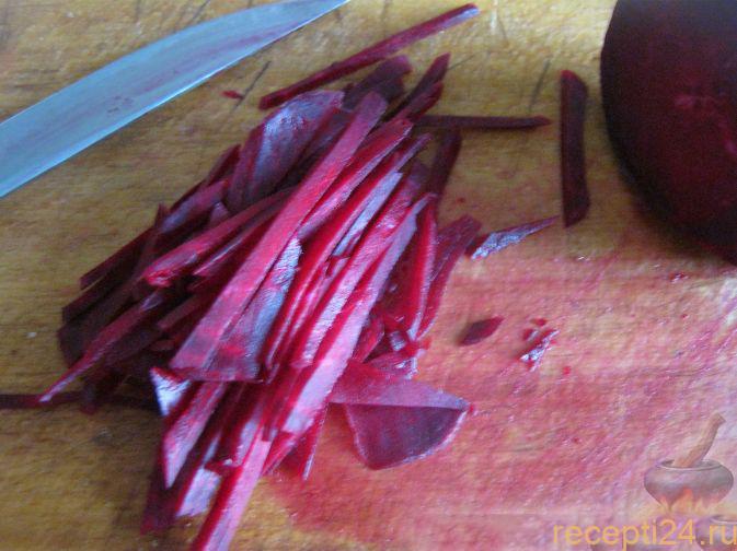 Свеклу можно нарезать тонкими ломтиками или натереть на терке. Делайте как вам больше нравиться!