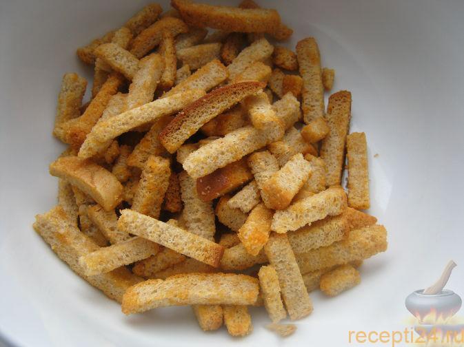 Сухарики у нас уже готовы их следует просто красиво уложить в конце. Так же вместо сухариков можно сделать картофель фри, но тут потребуется фритюр и больше времени на приготовление.