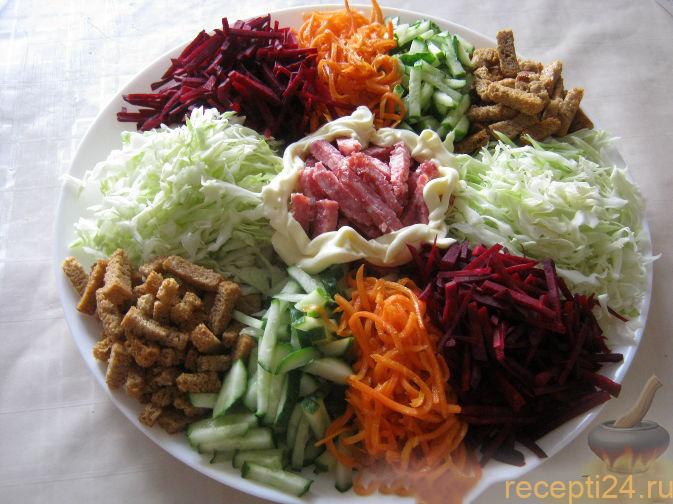 Последним шагом все ингредиенты выкладываем на большую тарелку. Каждый ингредиент лежит отдельно и не перемешиваются с другими. Как только вы уложили салат можно его посолить и поперчить по вкусу и полить маслом. Вместо масло можно использовать майонез. Майонезом можно визуально отделить каждый ингридиент.