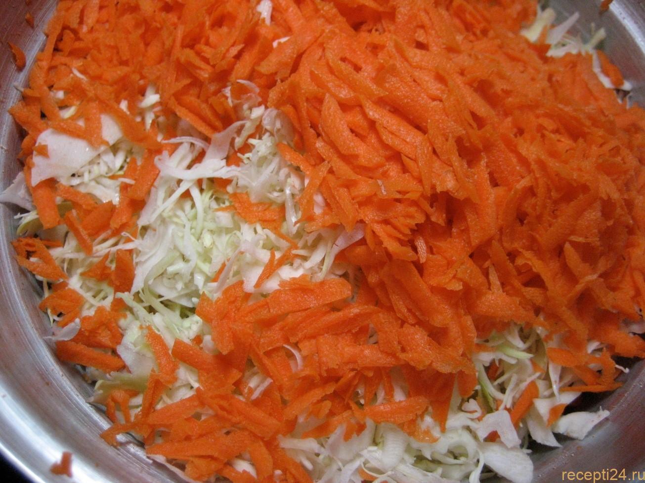 В миску для салата выкладывается остывшая капуста, к ней добавляется морковь, сахар, подсолнечное масло. Ингредиенты тщательно перемешиваются. Делать это нужно руками, слегка разминая все компоненты.