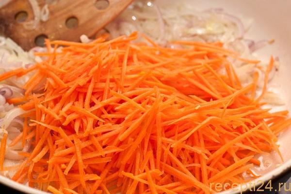 Морковь нарезается тоненькой соломкой. Лучше это делать на крупной терке.