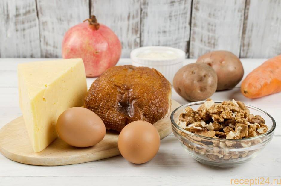 Что касается ингредиентов, вместо фундука хорошо подойдёт грецкий орех или миндаль, куриное мясо берите какой вам нравиться, копчённая грудка, отварная грудка, филе или окорочка. В нашем рецепте мы будем использовать копчёную грудку.