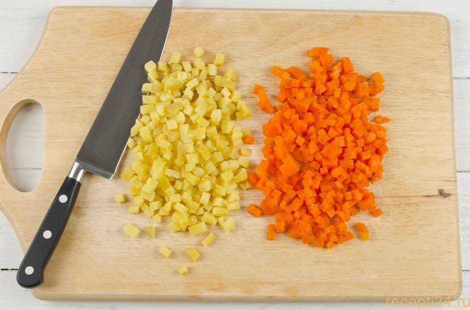 Отваренную морковь и картофель остудить до комнатной температуры и нарезать кубиками.