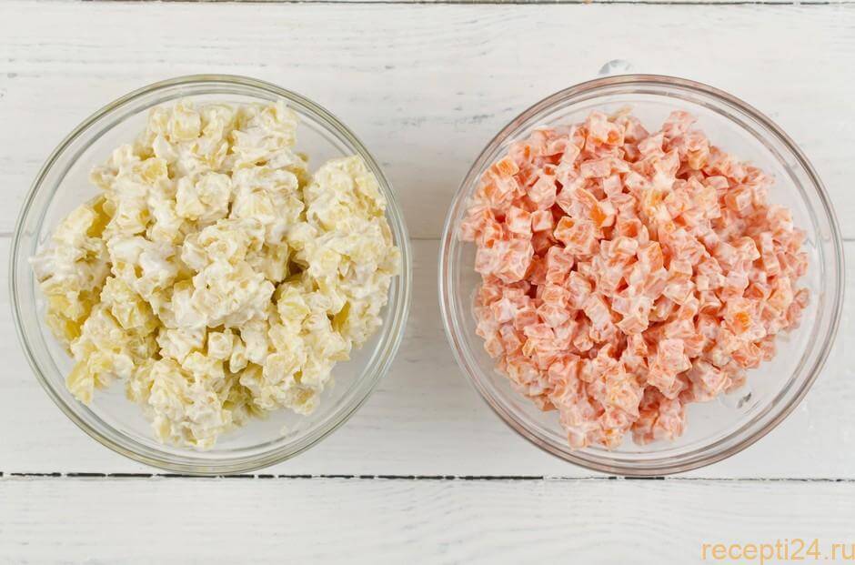 Кубики моркови и картофель положить в отдельные тарелки, добавить немного майонеза и перемешать.