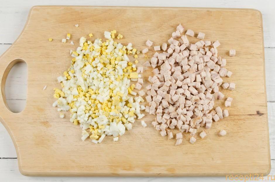 Так же яйца и куриное мясо нарезать кубиками и отложить в отдельные тары.