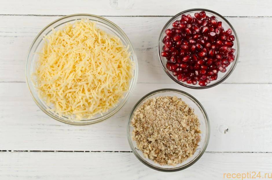 Сыр натереть на терке, примерно половину граната очистить и отдалить зёрнышки. Орехи желательно перемолоть до среднего размера. Сделать это можно в блендере на режиме (пульсирующий) или просто нарезать ножом.