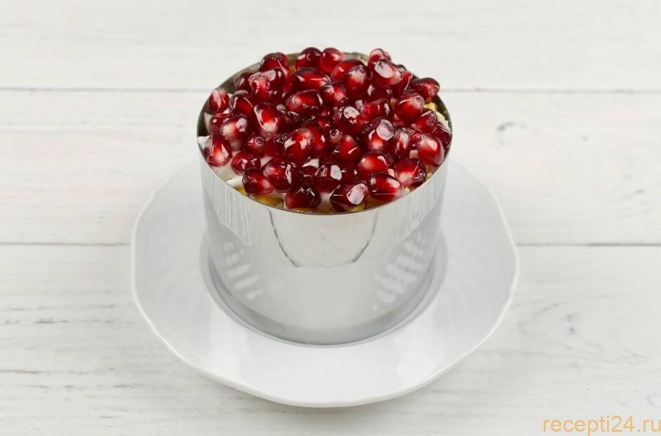 Салат Красная шапочка – получил такое название за свой внешний вид. Зерна граната украшают салат сверху в виде красной шапочки. Оригинальное сочетание ингредиентов в салате делает изюминой это блюдо на праздничном столе.