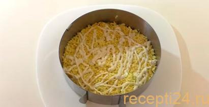Дальше выгружается тертый сыр. Поверх него льется заправка, и все посыпается тертыми белками.