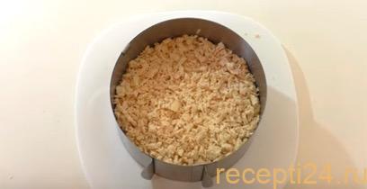 Поверх яичных желтков укладывается куриное филе. Его нужно покрыть сметанным соусом, как и первые два слоя.