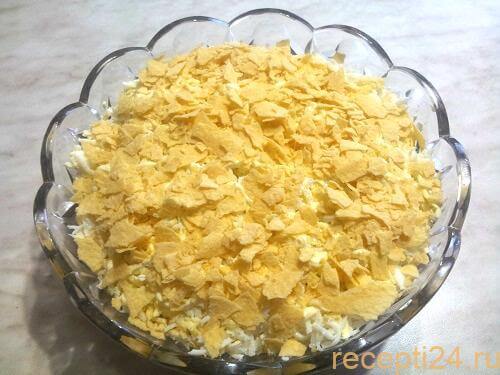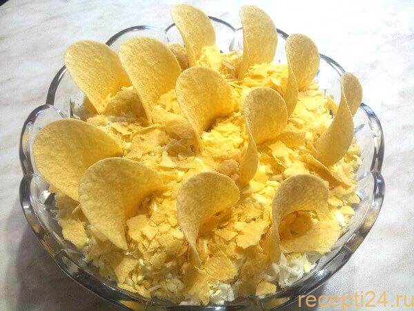 Чипсы наверное надо присыпать в последнюю очередь и уже перед самой подачей, а то они раскиснут от майонеза и не дадут ожидаемого вкуса.