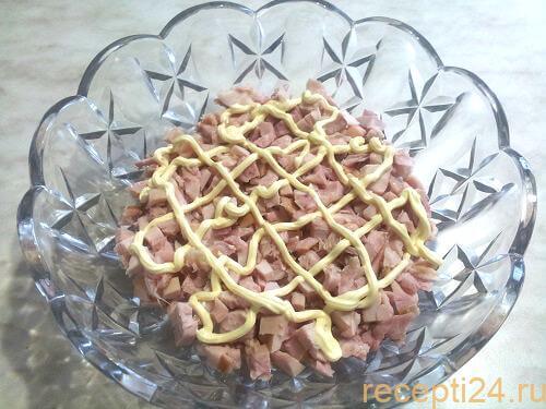 Нарезанное мясо выкладываем в салатницу. Это будем первый слой нашего салата. Слои будем связывать майонезом и на первый слой мяса добавляем майонез.