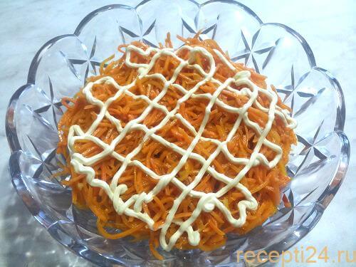 Вторым слоем добавляем корейскую морковь. Если ломтики моркови длинные их можно порезать, что бы было удобно кушать. И так же, как и на первый слой добавляем майонез.