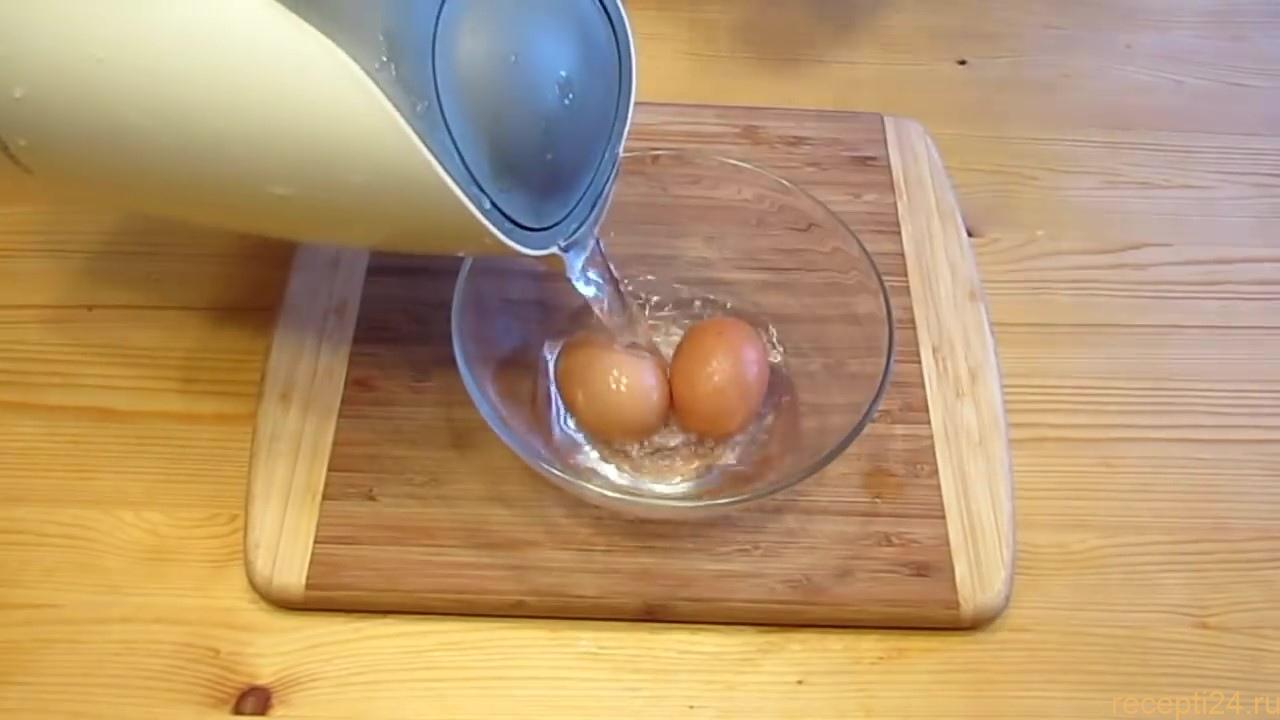 Для начало куриные яйца заливаем теплой водой, для того что бы они согрелись и не лопнули при варке.